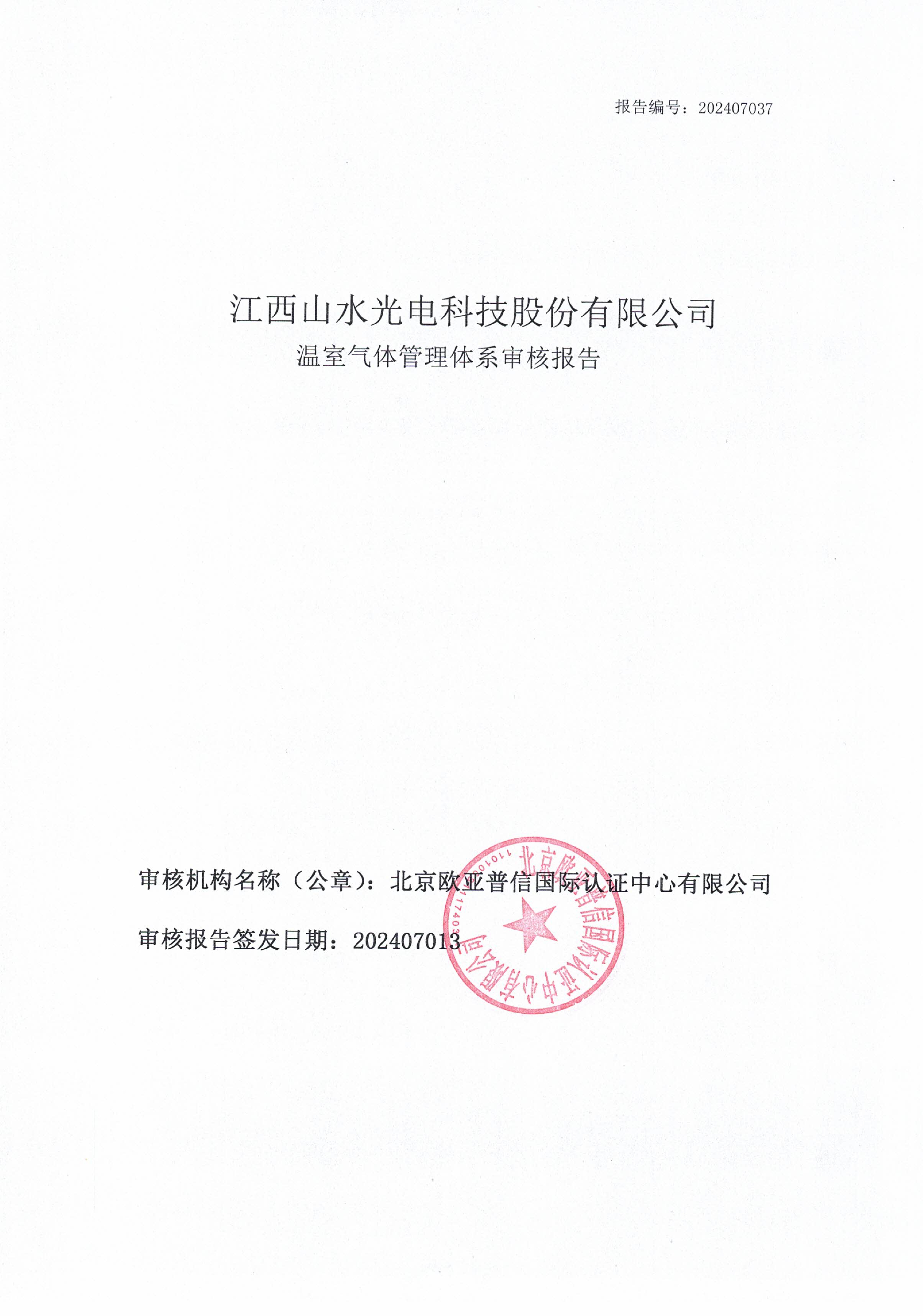 江西山水光電科技股份有限公司2023年度溫室氣體已通過北京歐亞普信國際認證中心核查并認證,相關證書和報告如下: